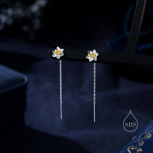 Daffodil Flower Threader Earrings in Sterling Silver, Daffodil with Dangle Chain Earrings, Daffodil Pull Through Chain Earrings