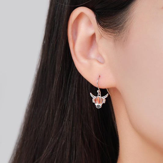 Enamel Highland Cow Drop Dangling Earrings in Sterling Silver, Scottish Inspired Highland Cow Hook Earrings