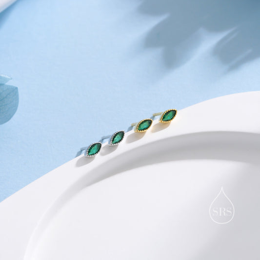 Extra Tiny Emerald Green Marquise CZ Stud Earrings in Sterling Silver, Silver or Gold, Dainty Marquise Crystal Earrings, Vintage Inspired
