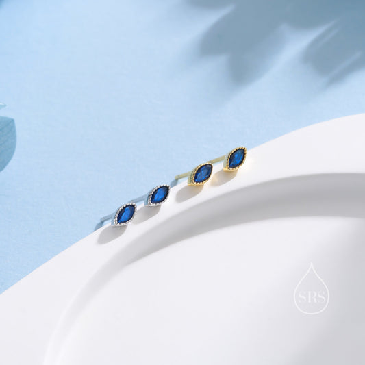 Extra Tiny Sapphire Blue Marquise CZ Stud Earrings in Sterling Silver, Silver or Gold, Dainty Marquise Crystal Earrings, Vintage Inspired