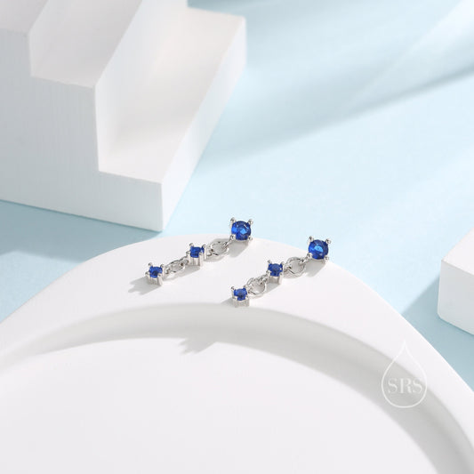 Sapphire Blue Triple CZ Dangle Chain Stud Drop Earrings in Sterling Silver, Silver or Gold, Three CZ Chain Earrings, CZ Drop Earrings