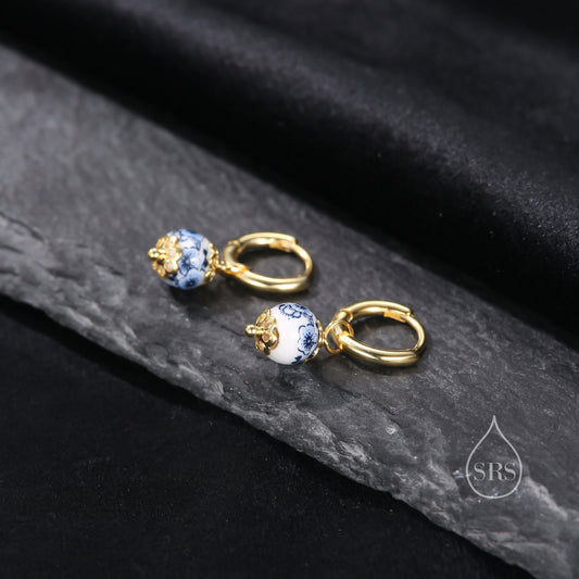 Plum Blossom Print Ceramic Beads Hoop Earrings in Sterling Silver, Silver or Gold , 6mm Porcelain Beads, Ceramic Beads Earrings