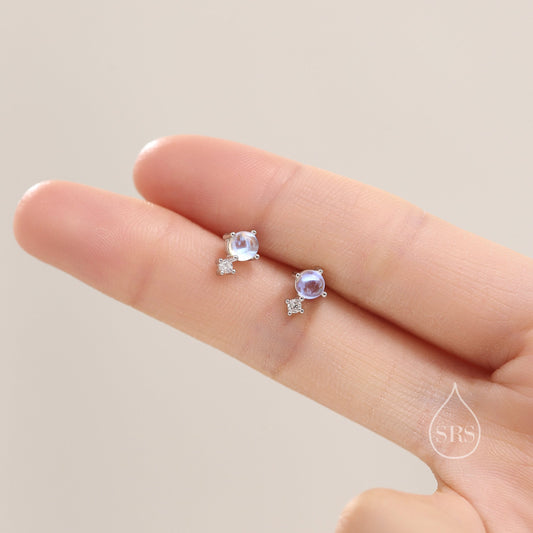 Sterling Silver Tiny Moonstone and CZ Stud Earrings, Tiny Moonstone Earrings, Lab Created Moonstone Earrings