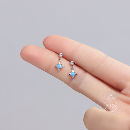 Tiny Blue Opal Star Dangle Stud Earrings in Sterling Silver, Silver or Gold, Lab Opal Star Earrings, Sunburst Earrings, Celestial