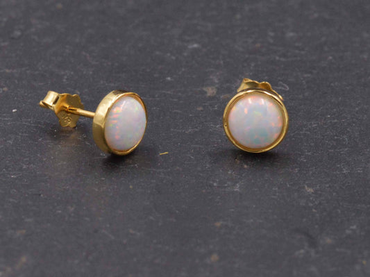 Gold Vermeil (Gold Plated Sterling Silver) Blue and White Opal Stone Crystal Stud Earrings. Round Minimalist Dot Geometric Design.