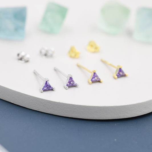 Extra Tiny Amethyst Purple CZ Triangle Stud Earrings in Sterling Silver, Silver or Gold, Dainty Earrings, Stacking Earrings, CZ Stud