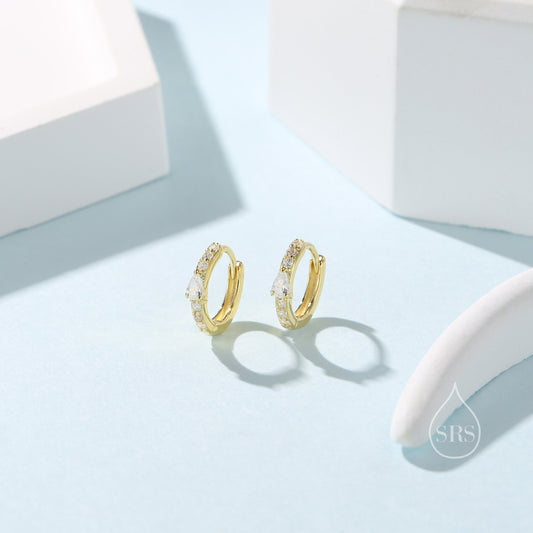 Tiny CZ Huggie Hoop Earrings in Sterling Silver with Pear CZ, Silver or Gold, Droplet CZ Hoops