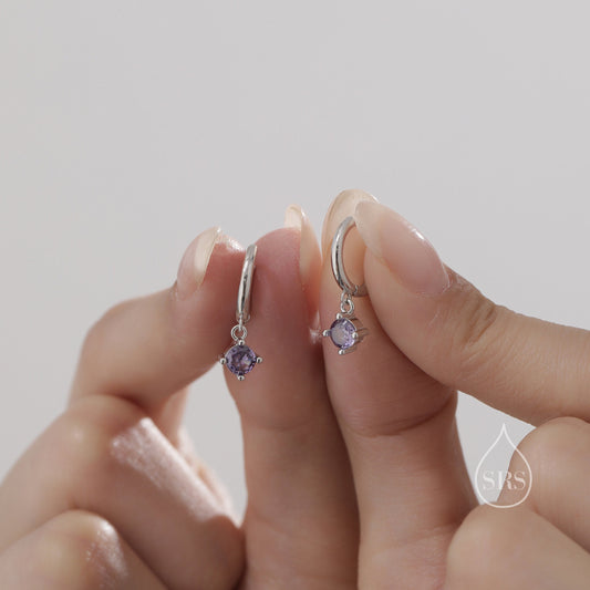 Minimalist Tiny Purple CZ Dangle Huggie Hoop Earrings in Sterling Silver, Silver or Gold or Rose Gold, Tiny CZ Skinny Hoops, Amethyst Purple