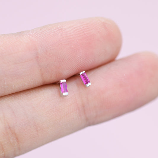Ruby Red Tiny Baguette CZ Stud Earrings in Sterling Silver, Silver or Gold, Geometric Tiny Pink CZ Earrings, Stacking Earrings