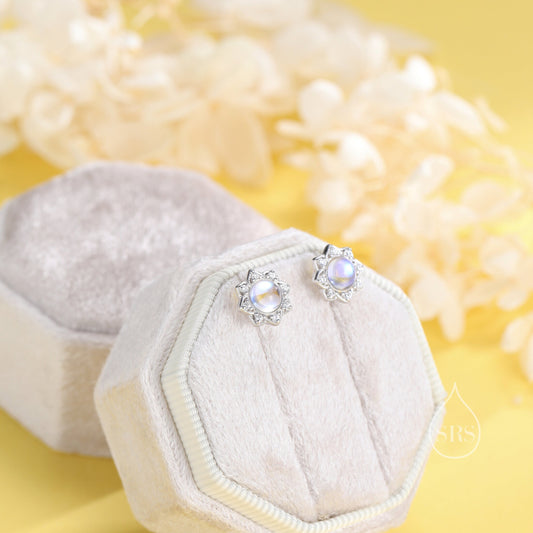 Vintage Inspired Moonstone Flower CZ Stud Earrings, Lab Moonstone Halo CZ Earrings, Simulated Moonstone Earrings