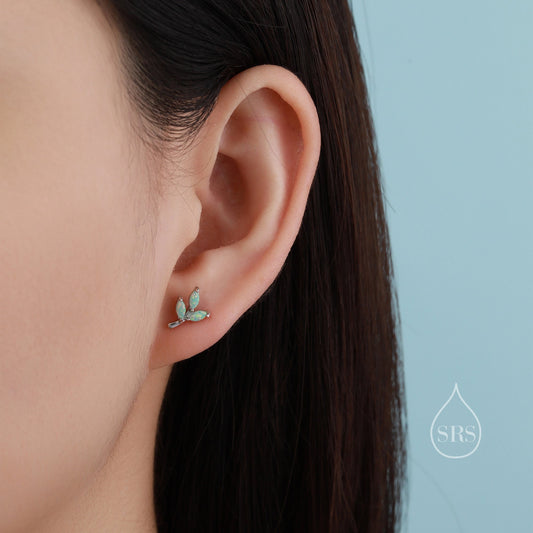 Tiny Little Opal Leaf Stud Earrings in Sterling Silver, Silver or Gold, Olive Leaf Earrings with Lab Opal, Opal Leaf Earrings