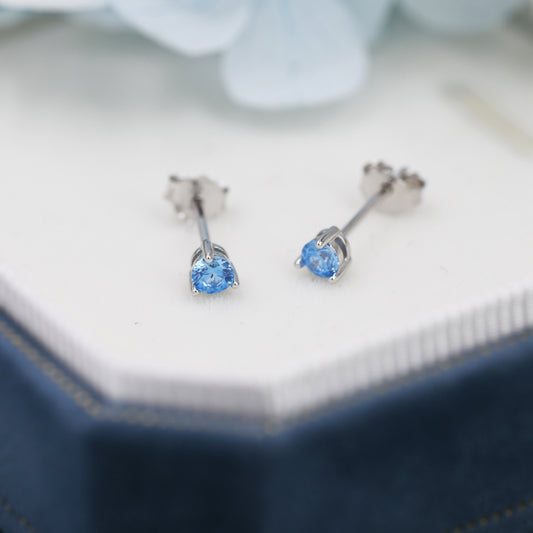 Aquamarine Blue CZ Stud Earrings in Sterling Silver, 3mm, Three Prong, Blue Stacking Earrings