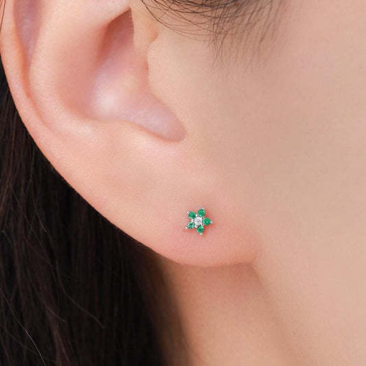Very Small Emerald Green CZ Flower Stud Earrings in Sterling Silver, Silver or Gold, Crystal Flower Earrings, Stacking Earrings