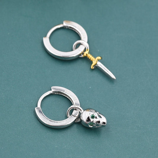 Mismatched Skull and Sword Huggie Hoop Earrings in Sterling Silver, Tiny Detachable Skull and Sword Charms, Silver Skull Hoop Earrings