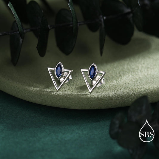 Sterling Silver Triangle and Sapphire Blue Marquise CZ Arrow Arrowhead Stud Earrings, Silver, Gold, Open Triangle Earrings