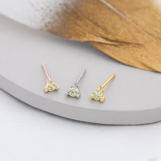Sterling Silver Peridot Green Stud Earrings, 3mm August Birthstone CZ Earrings, Three Prong, Silver, Gold or Rose Gold, Stacking Earrings