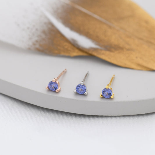 Sterling Silver Tanzanite Blue Stud Earrings, 3mm December Birthstone CZ Earrings, Three Prong, Silver, Gold or Rose Gold, Stacking Earring