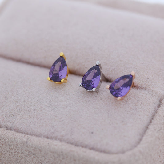 Sterling Silver Pear Cut Amethyst CZ Earrings, Purple Droplet Earrings, February Birthstone CZ Earrings, Silver, Gold or Rose Gold