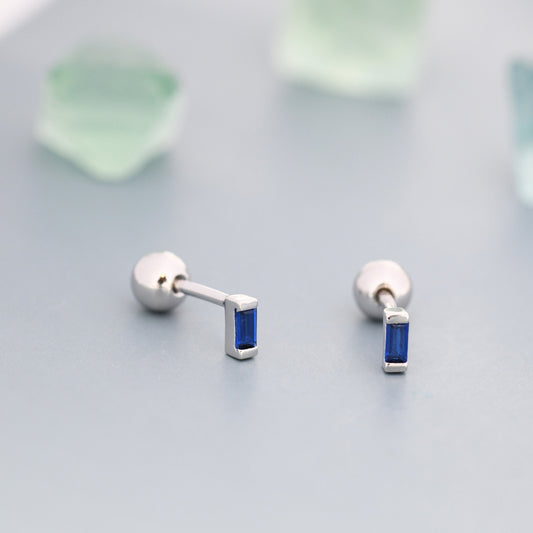 Extra Tiny Sapphire Blue Baguette CZ Screw Back Earrings in Sterling Silver, Silver or Gold, Stacking Earrings, Barbell Earrings