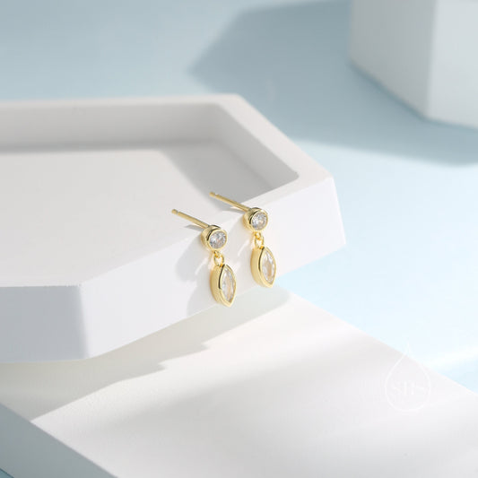 Tiny Double CZ Stud Earrings in Sterling Silver with Round and Marquise CZ, Silver or Gold, Bezel Set Earrings