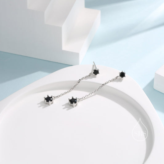 Black CZ Dangle Chain Stud Drop Earrings in Sterling Silver, Silver or Gold, Geometric Double CZ Chain Earrings, CZ Long Drop Earrings