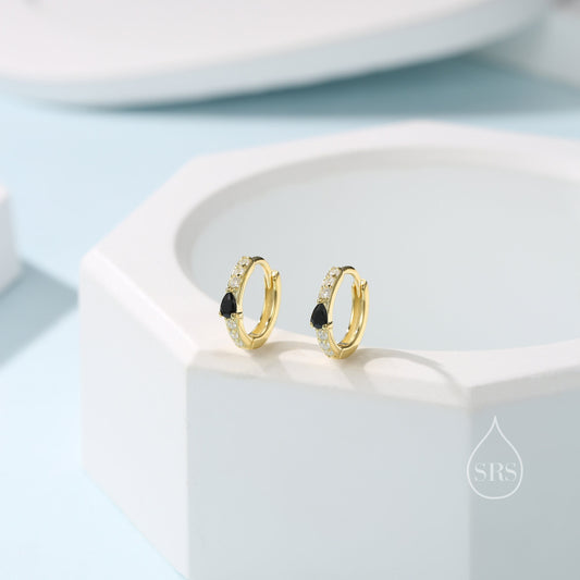 Tiny CZ Huggie Hoop Earrings in Sterling Silver with Black Pear CZ, Silver or Gold, Droplet CZ Hoops