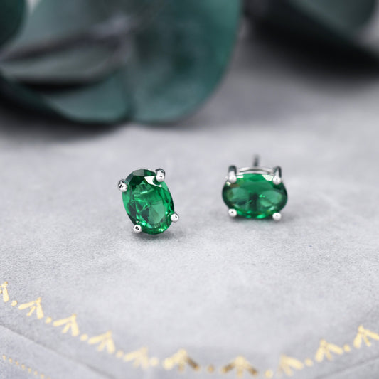 Emerald Green Oval CZ Stud Earrings in Sterling Silver, 5x7mm, Oval Cut Crystal Earrings, May Birthstone