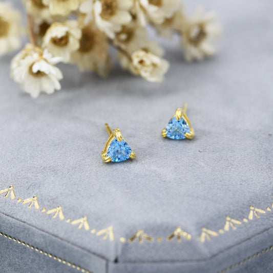 Trillion Cut Aquamarine Blue CZ Stud Earrings in Sterling Silver, Silver or Gold, Trillion Cut Zirconia Earrings, Double Pronged, Tiny Stud