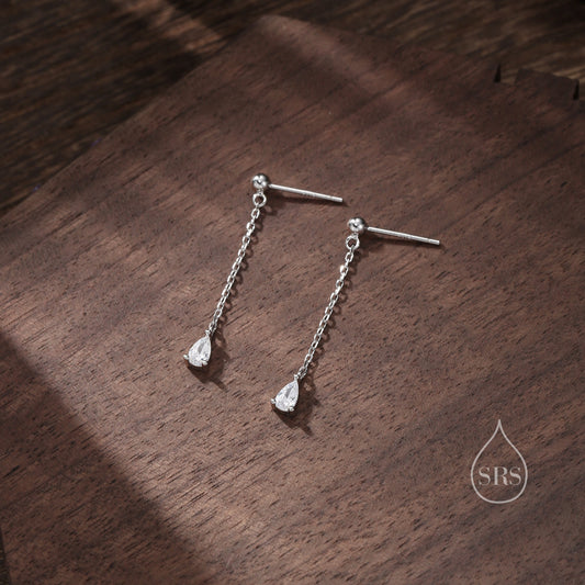 Droplet CZ with Chain Dangle Stud Earrings in Sterling Silver, Silver or Gold, Clear CZ Pear Drop Earrings