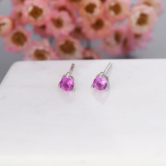 Ruby Pink CZ Tiny Stud Earrings in Sterling Silver, Silver or Gold, 3mm, Three Prong, Pink Stacking Earrings, July Birthstone
