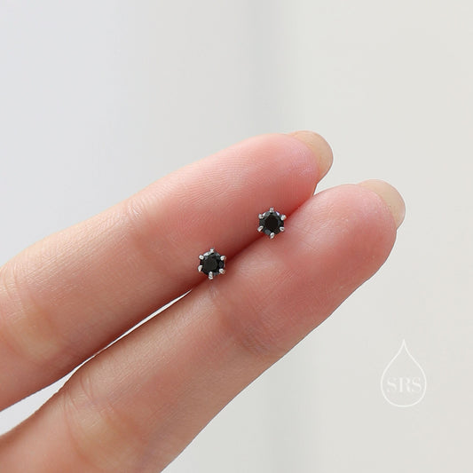 Tiny Little Prong Set Black CZ Stud Earrings in Sterling Silver, Silver or Gold, 6 Prong 3mm CZ Earrings