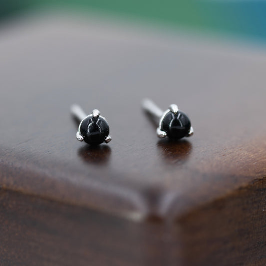 Natural Black Onyx Stud Earrings in Sterling Silver, Semi-Precious Gemstone Earrings, 3mm and 3 prong Genuine Black Onyx Earrings