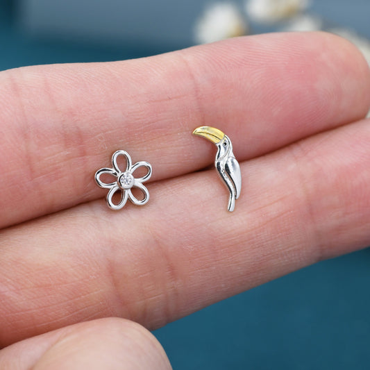 Mismatched Toucan and Flower Stud Earrings in Sterling Silver, Asymmetric Toucan Bird and Daisy Earrings