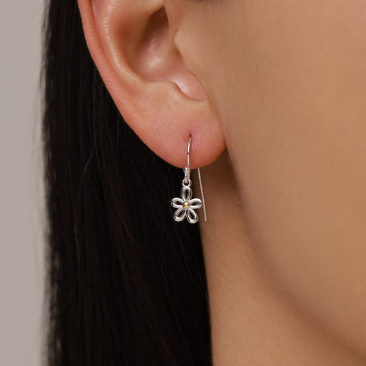 Sterling Silver Two Tone Daisy Flower Drop Earrings with Hooks