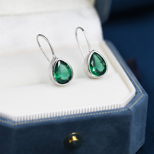Sterling Silver Emerald Green Droplet Drop Earrings in Sterling Silver, Silver or Gold, Chunky Pear Shape Hook Earrings
