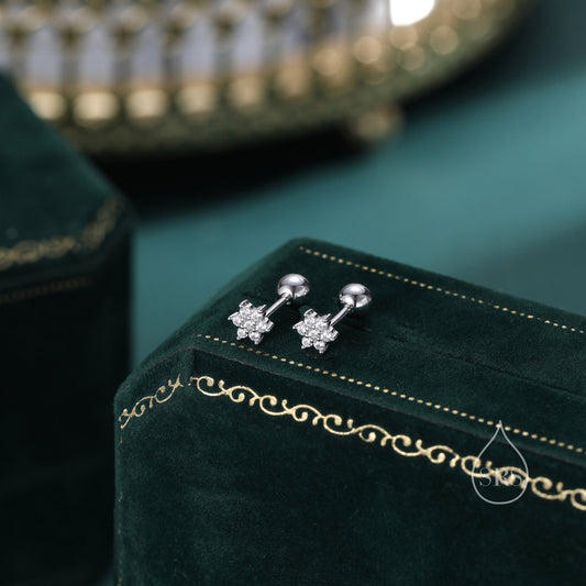 Dainty Flower CZ Internally Threaded Flat Back / Screw Back / Stud Earrings in Sterling Silver, Silver or Gold, Snowflake Barbell Piercing Earrings