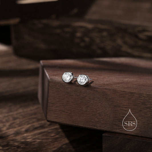5mm Bezel CZ Crystal Stud Earrings in Sterling Silver, Silver or Gold, Available in butterfly backs or screw backs, Brilliant Cut CZ