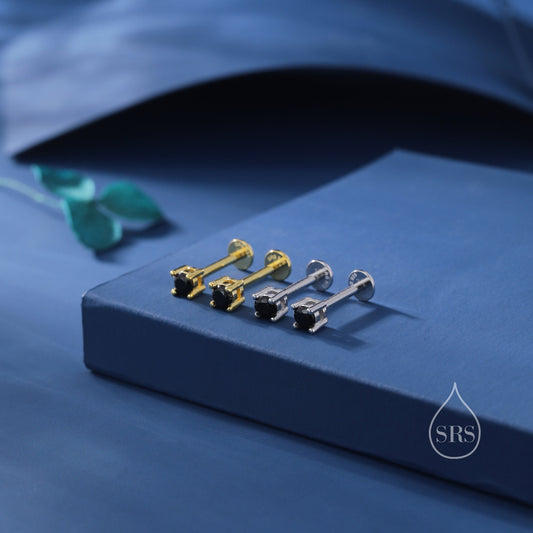 Black CZ Internally Threaded Flat Back / Screw Back /Stud Earrings in Sterling Silver,4mm CZ, Black CZ Barbell Earrings, Silver or Gold