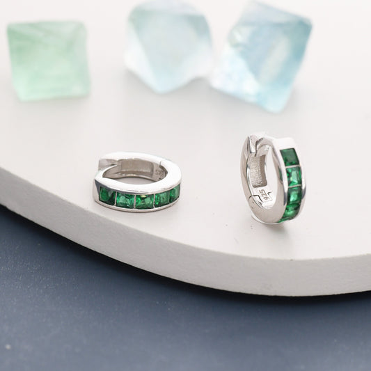Emerald Green CZ 3mm Huggie Hoop in Sterling Silver, Silver or Gold, 7mm Inner Diameter Hoop Earrings, May Birthstone, Princess Cut
