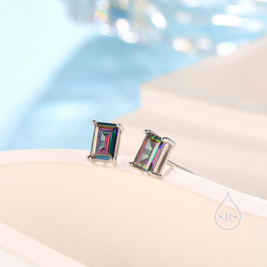 Emerald Cut Mystic Black CZ Stud Earrings in Sterling Silver, Rectangular Cut Crystal Earrings, Mystic Topaz