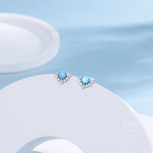 Vintage Inspired Blue Opal Flower CZ Stud Earrings, Lab Opal Halo CZ Earrings, Simulated Opal Earrings