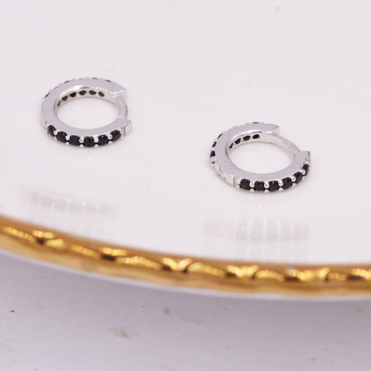 Minimalist Huggie Hoop Earrings in Sterling Silver with Black CZ Crystals, Tiny Snug Hoop Earrings, Black Diamond, Simple Hoop Earrings