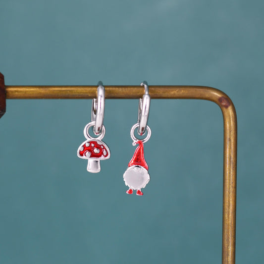 Mismatched Gnome and Mushroom Huggie Hoop Earrings in Sterling Silver with Hand Painted Enamel, Winter Earrings, Christmas Earrings