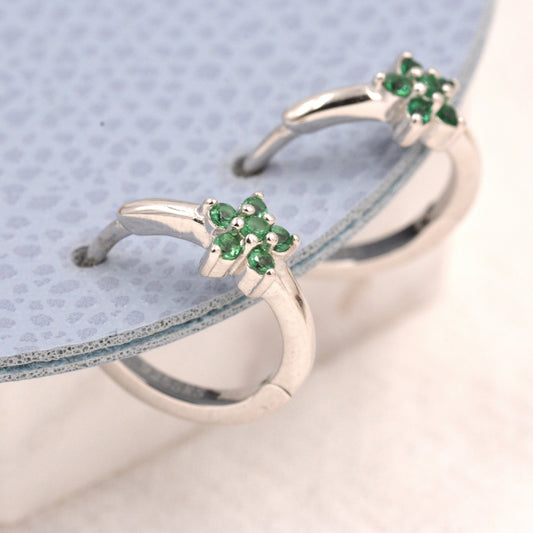 Tiny Emerald Green CZ Flower Huggie Hoops, CZ Hoop Earrings, Crystal Flower Huggie Earrings, Emerald Huggie Earrings