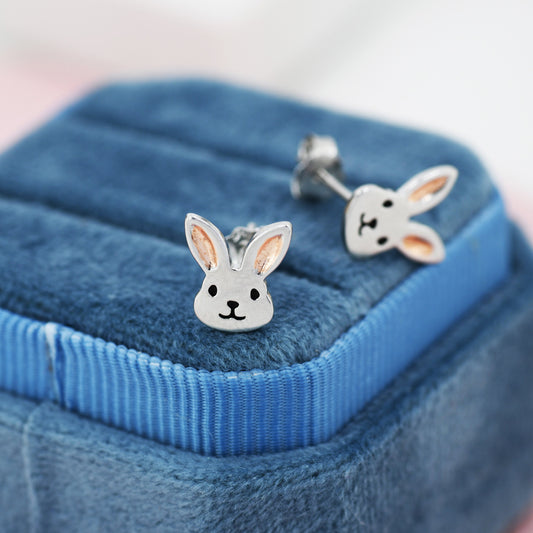 Cute Bunny Head Earrings in Sterling Silver, Silver and Rose Gold, Rabbit Stud Earrings, Rabbit Head Earrings, Animal Earrings