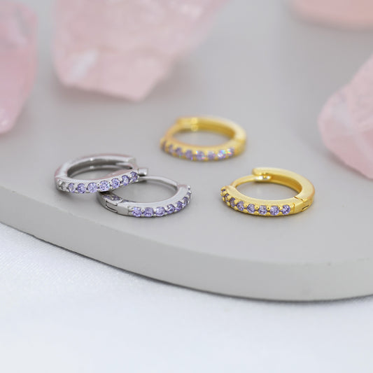 Amethyst Purple CZ Huggie Hoops in Sterling Silver, Silver or Gold, Minimalist Hoop Earrings, 6mm, 7mm and 8mm Hoops, Cartilage Hoops