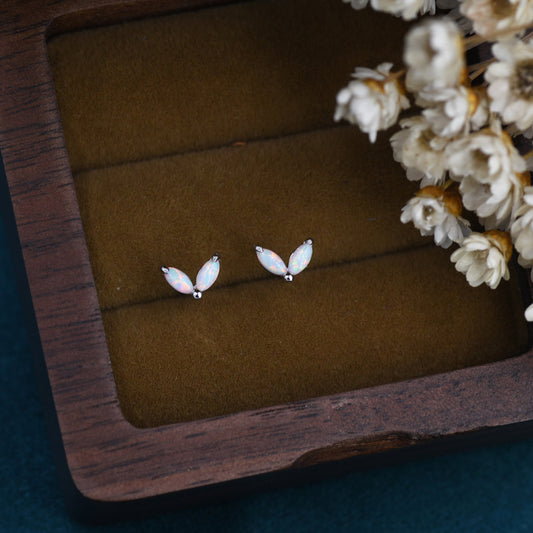 Sterling Silver White Opal Marquise Leaf Internally Threaded Flat Back/Screw Back/ Stud Earrings, Marquise Fan Stud, Opal Crown Stud