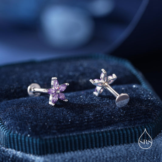 Internally Threaded Sterling Silver Purple Amethyst CZ Flower Flat Back/Screw Back/ Stud Earrings in Sterling Silver, Silver or Gold