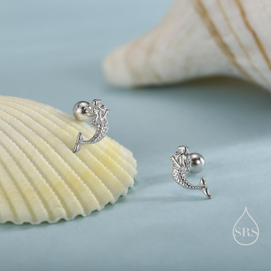 Tiny Mermaid Internall Threaded Flat Back / Screw Back / Stud Earrings in Sterling Silver, Silver, Gold or Rose Gold, Mermaid Fish Earrings