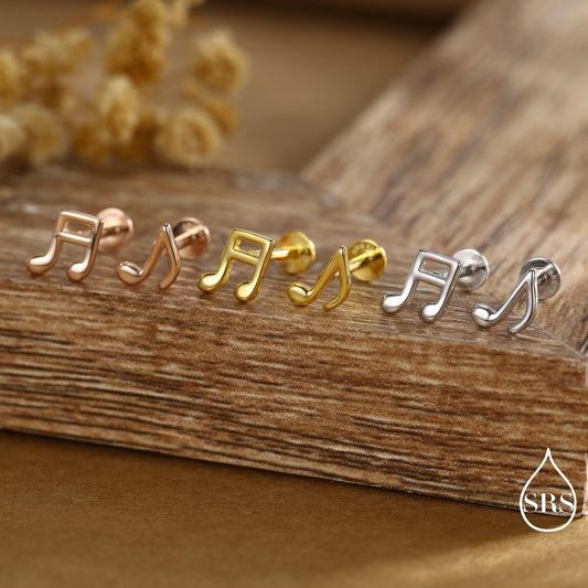Internally Threaded Music Notes Flat Back / Screw Back / Stud Earrings in Sterling Silver, Mismatched Music Symbol Stud Earrings